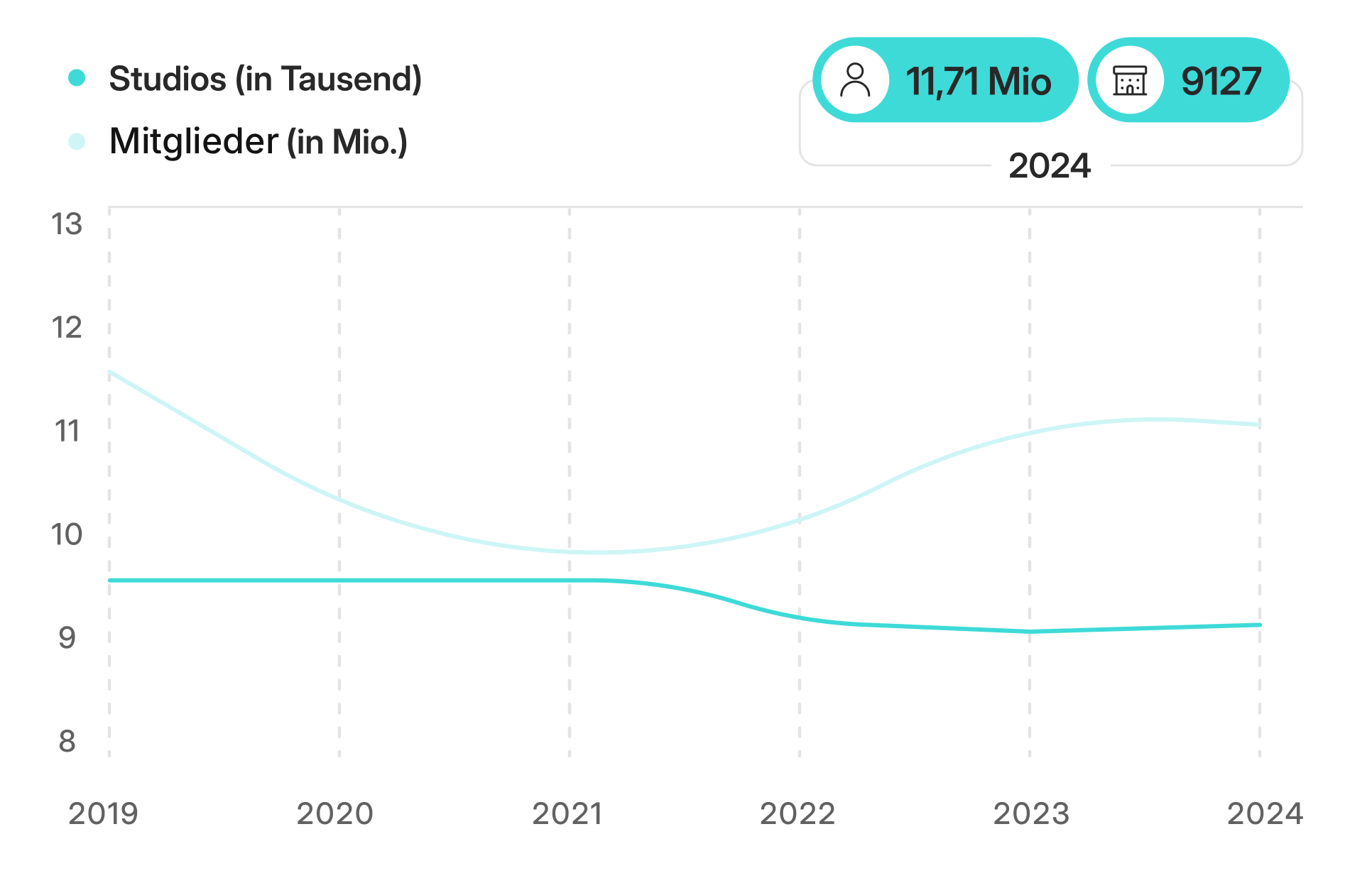 Mit ca. 12 Millionen Mitgliedern im Jahr 2024/25 und über 9.000 Studios gibt es eine begrenzte Anzahl an potenziellen Neukunden. Alle kämpfen um die gleiche Zielgruppe. Der Markt wächst in bestimmten Zielgruppen nicht so wie er könnte/müsste und Mitglieder wechseln nur noch zwischen verschiedenen Studios. Den Personallosen, den Discountern und Firmenfitness.